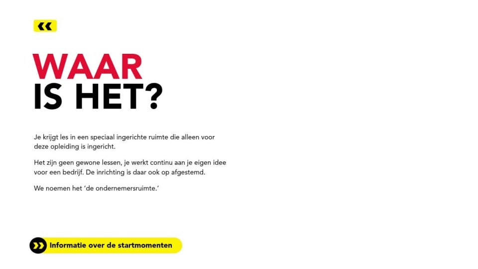 Het zijn geen gewone lessen, je werkt continu aan je eigen idee voor een bedrijf. De inrichting is daar ook op afgestemd.