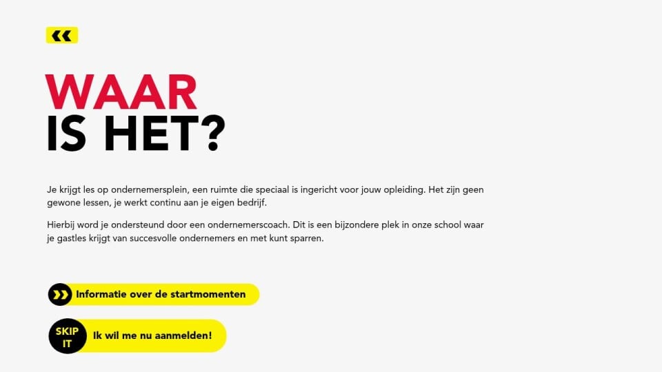 Je krijgt les op ondernemersplein, een ruimte die speciaal is ingericht voor jouw opleiding. Het zijn geen gewone lessen, je werkt continu aan je eigen bedrijf.