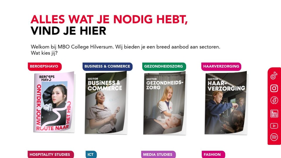 Welkom bij MBO College Hilversum. Wij bieden je een breed aanbod aan sectoren. Wat kies jij?
