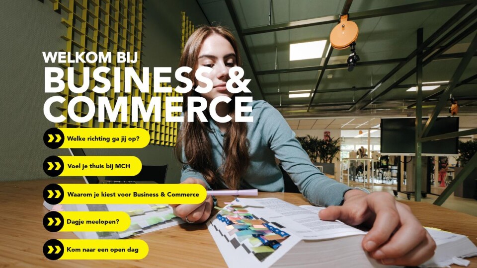 Diploma op zak en klaar voor de volgende stap? Jij wilt slagen in de wereld van business. Bij Business & Commerce investeer je in jezelf, leer je de juiste mensen kennen en bouw je aan je toekomst. Je ontwikkelt kennis, vaardigheden én een netwerk dat je verder helpt. Jij bent gemaakt om te slagen.