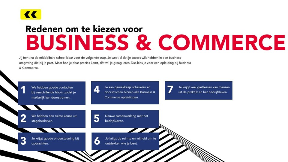 Jij bent na de middelbare school klaar voor de volgende stap. Je weet al dat je succes wilt hebben in een business-omgeving die bij je past. Maar hoe je daar precies komt, dàt wil je graag leren. Dus kies je voor een opleiding bij Business & Commerce.
