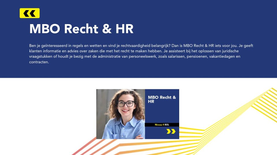 Ben je geïnteresseerd in regels en wetten en vind je rechtvaardigheid belangrijk? Dan is MBO Recht & HR iets voor jou. Je geeft klanten informatie en advies over zaken die met het recht te maken hebben. Je assisteert bij het oplossen van juridische vraagstukken of houdt je bezig met de administratie van personeelswerk, zoals salarissen, pensioenen, vakantiedagen en contracten.