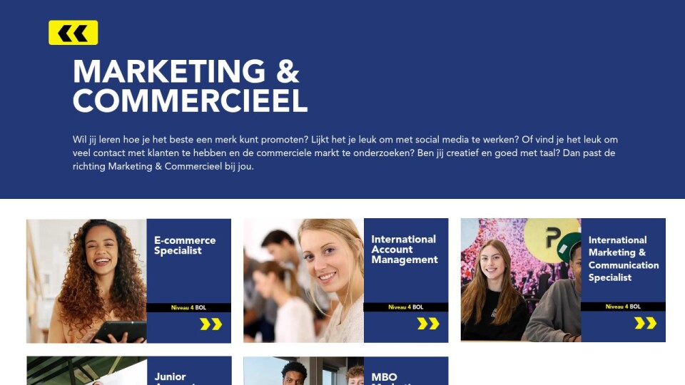 Wil jij leren hoe je het beste een merk kunt promoten? Lijkt het je leuk om met social media te werken? Of vind je het leuk om veel contact met klanten te hebben en de commerciele markt te onderzoeken? Ben jij creatief en goed met taal? Dan past de richting Marketing & Commercieel bij jou.