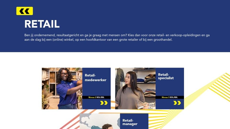 Ben jij ondernemend, resultaatgericht en ga je graag met mensen om? Kies dan voor onze retail- en verkoop-opleidingen en ga aan de slag bij een (online) winkel, op een hoofdkantoor van een grote retailer of bij een groothandel.
