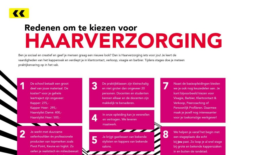 Naast de basisopleidingen bieden we je ook nog keuzedelen aan. Je kunt bijvoorbeeld kiezen voor Visagie, Barbier, Klantcontact & Verkoop, Peercoaching of Persoonlijk Profileren. Daarmee maak je jezelf nog interessanter voor je toekomstige werkgever!