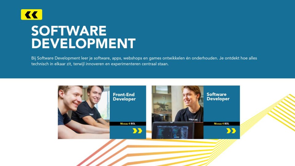 Bij Software Development leer je software, apps, webshops en games ontwikkelen én onderhouden. Je ontdekt hoe alles technisch in elkaar zit, terwijl innoveren en experimenteren centraal staan.