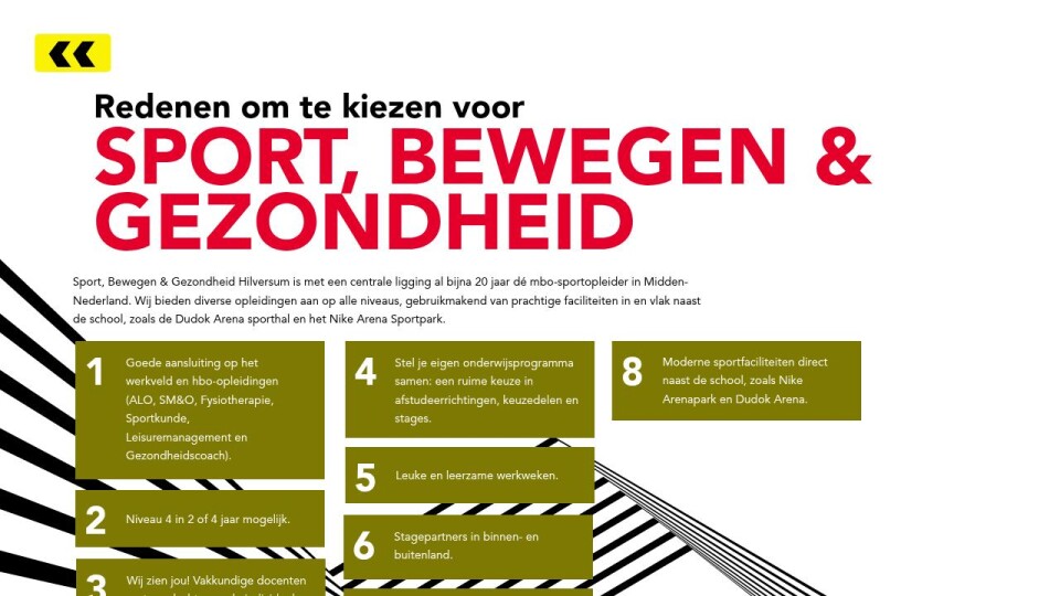 Sport, Bewegen & Gezondheid Hilversum is met een centrale ligging al bijna 20 jaar dé mbo-sportopleider in Midden- Nederland. Wij bieden diverse opleidingen aan op alle niveaus, gebruikmakend van prachtige faciliteiten in en vlak naast de school, zoals de Dudok Arena sporthal en het Nike Arena Sportpark.