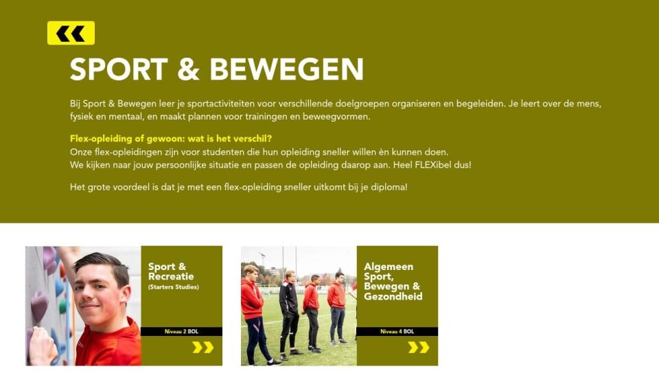 Bij Sport & Bewegen leer je sportactiviteiten voor verschillende doelgroepen organiseren en begeleiden. Je leert over de mens, fysiek en mentaal, en maakt plannen voor trainingen en beweegvormen.