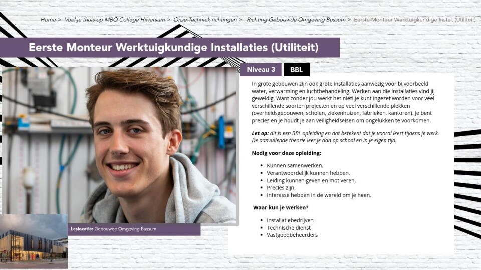 In grote gebouwen zijn ook grote installaties aanwezig voor bijvoorbeeld water, verwarming en luchtbehandeling. Werken aan die installaties vind jij geweldig. Want zonder jou werkt het niet! Je kunt ingezet worden voor veel verschillende soorten projecten en op veel verschillende plekken (overheidsgebouwen, scholen, ziekenhuizen, fabrieken, kantoren). Je bent precies en je houdt je aan veiligheidseisen om ongelukken te voorkomen.