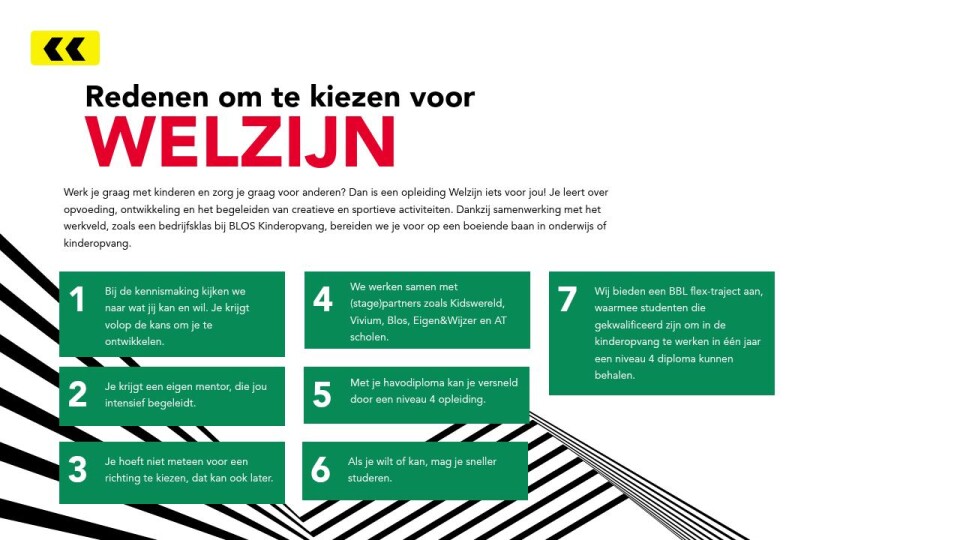 Werk je graag met kinderen en zorg je graag voor anderen? Dan is een opleiding Welzijn iets voor jou! Je leert over opvoeding, ontwikkeling en het begeleiden van creatieve en sportieve activiteiten. Dankzij samenwerking met het werkveld, zoals een bedrijfsklas bij BLOS Kinderopvang, bereiden we je voor op een boeiende baan in onderwijs of kinderopvang.