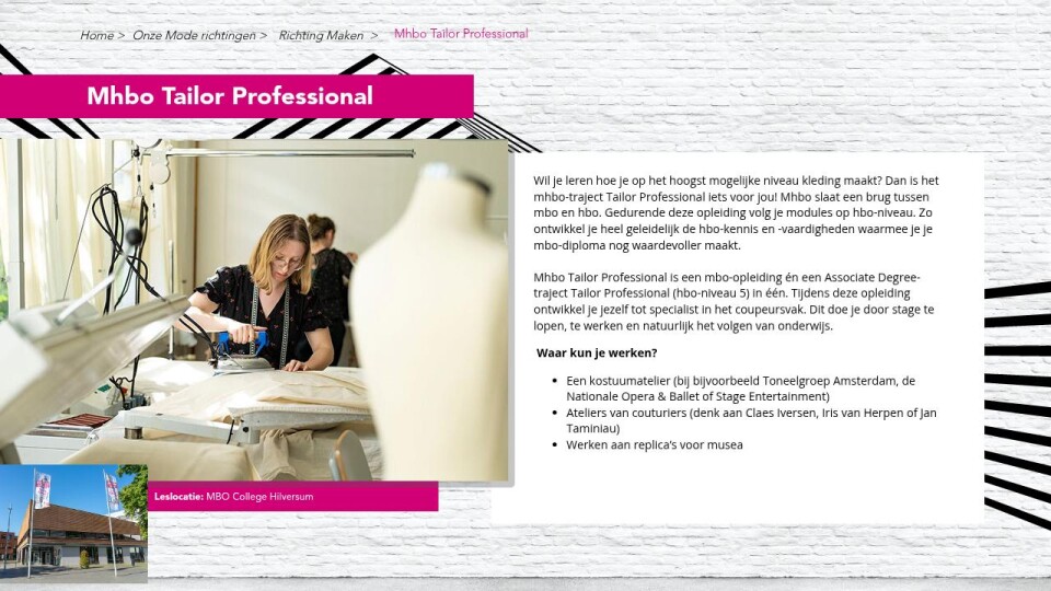Wil je leren hoe je op het hoogst mogelijke niveau kleding maakt? Dan is het mhbo-traject Tailor Professional iets voor jou! Mhbo slaat een brug tussen mbo en hbo. Gedurende deze opleiding volg je modules op hbo-niveau. Zo ontwikkel je heel geleidelijk de hbo-kennis en -vaardigheden waarmee je je mbo-diploma nog waardevoller maakt.