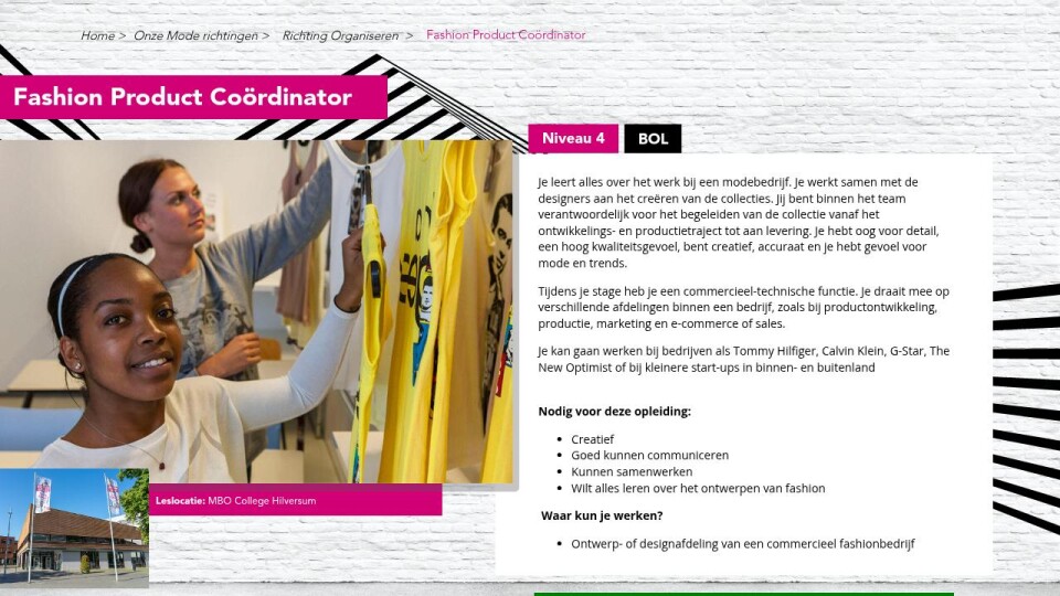 Je kan gaan werken bij bedrijven als Tommy Hilfiger, Calvin Klein, G-Star, The New Optimist of bij kleinere start-ups in binnen- en buitenland