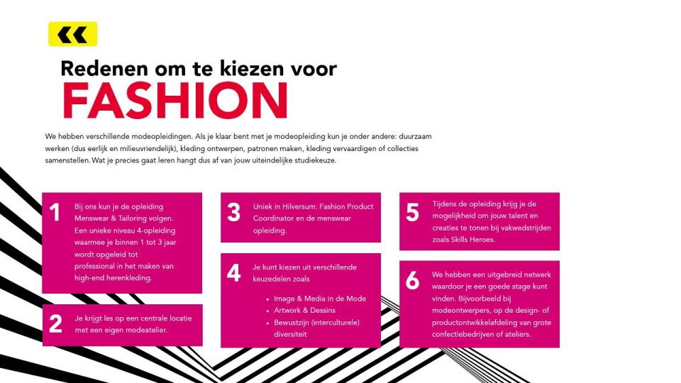 We hebben verschillende modeopleidingen. Als je klaar bent met je modeopleiding kun je onder andere: duurzaam werken (dus eerlijk en milieuvriendelijk), kleding ontwerpen, patronen maken, kleding vervaardigen of collecties samenstellen. Wat je precies gaat leren hangt dus af van jouw uiteindelijke studiekeuze.